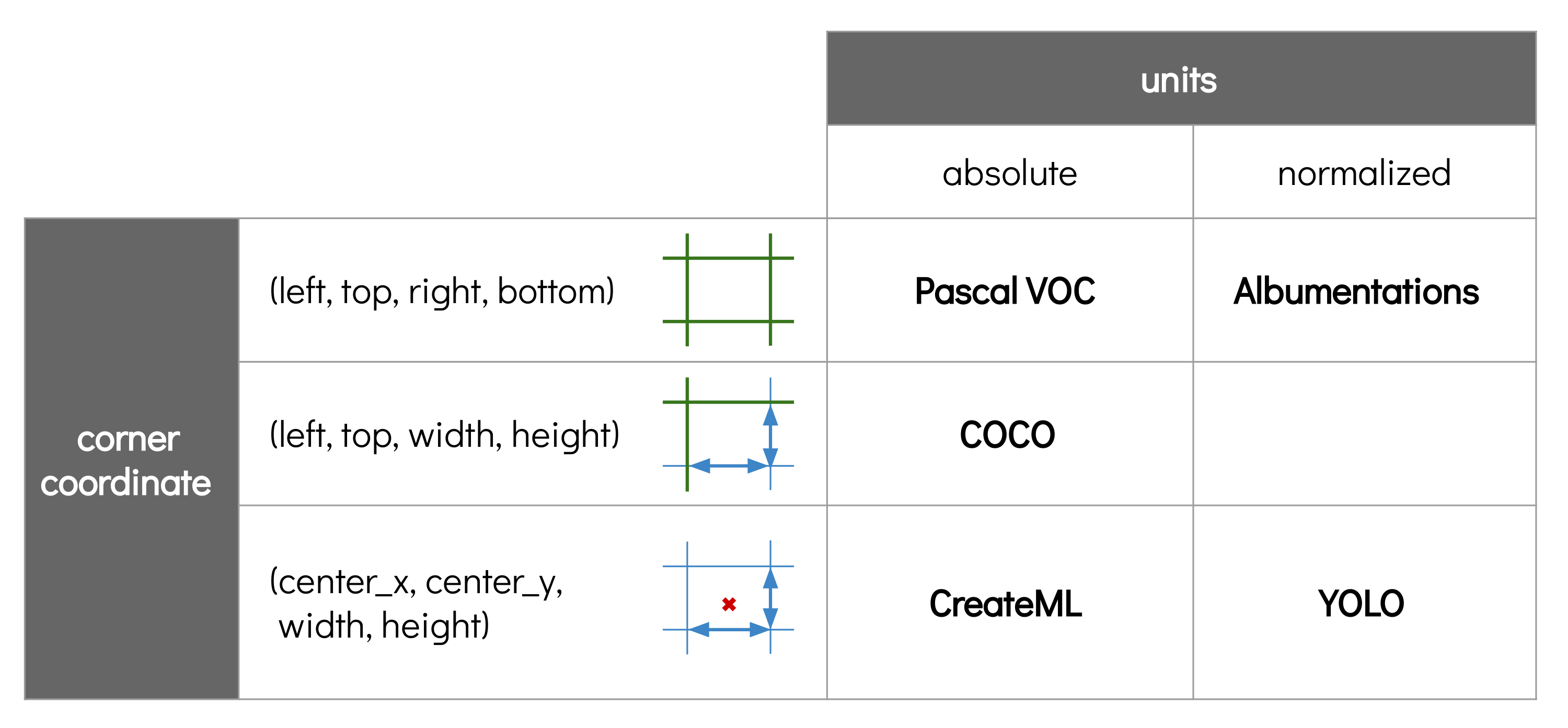 There are 3 ways that are used to express the four corners of the bounding box. All of them consist of a list of 4 numbers, but the meaning of the number in each position changes.